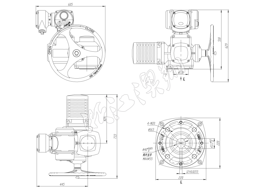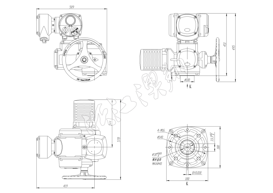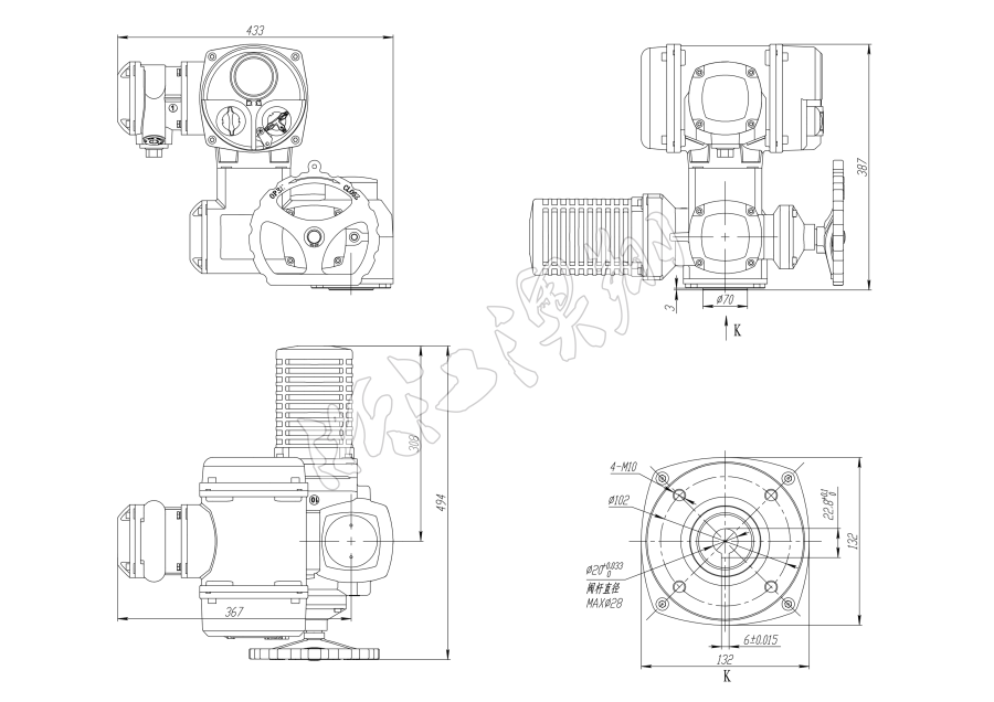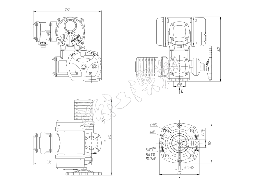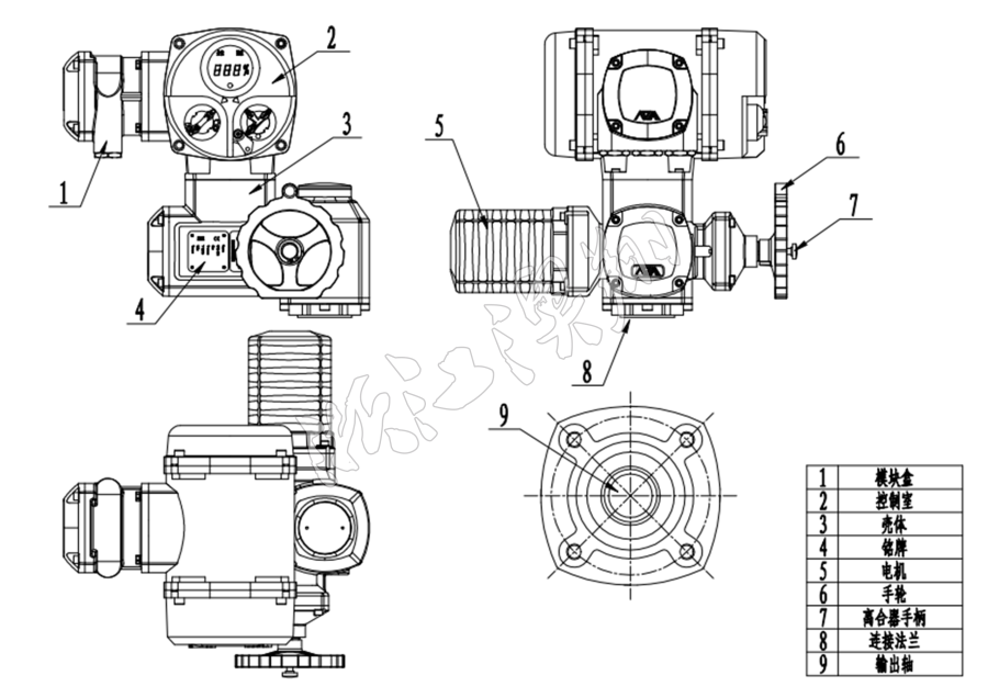 底部安裝尺寸符合ISO5210標(biāo)準(zhǔn),驅(qū)動軸套可拆下根據(jù)需要進(jìn)行加工,兼容性好。可以垂直安裝,也可以水平安裝。