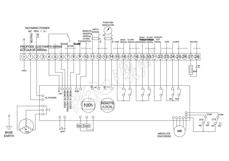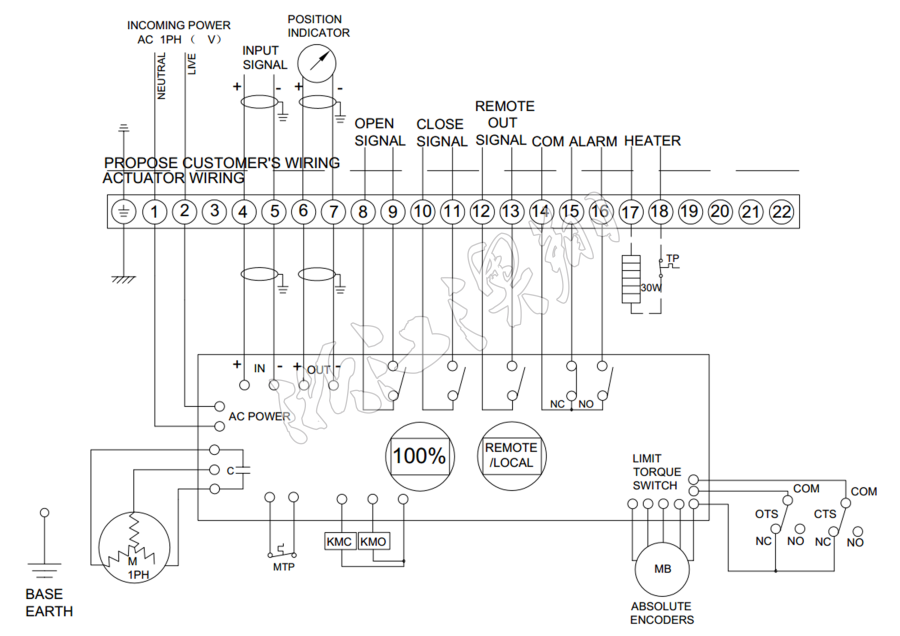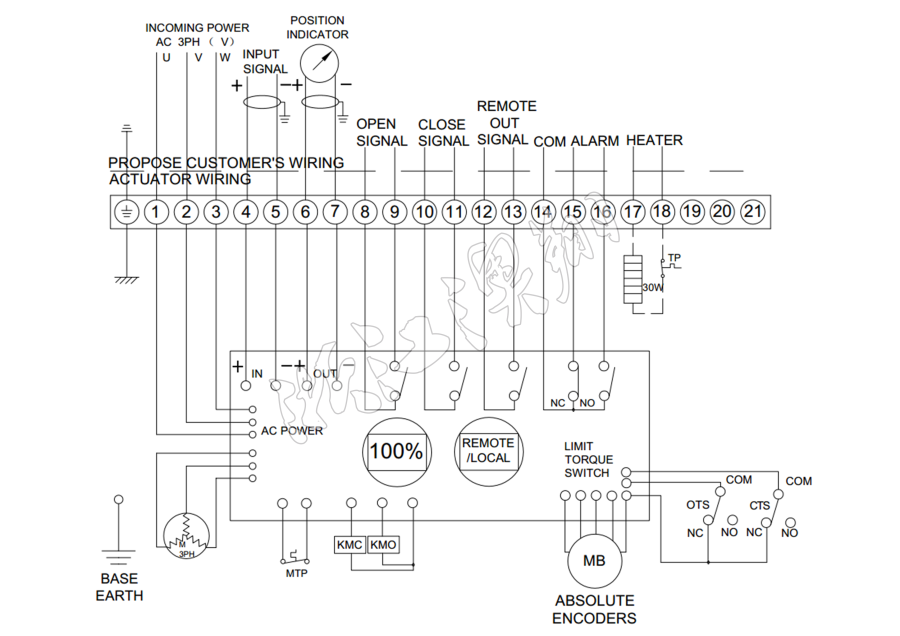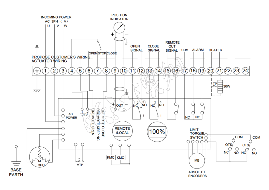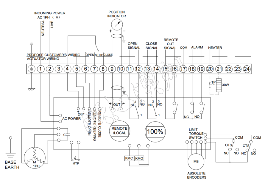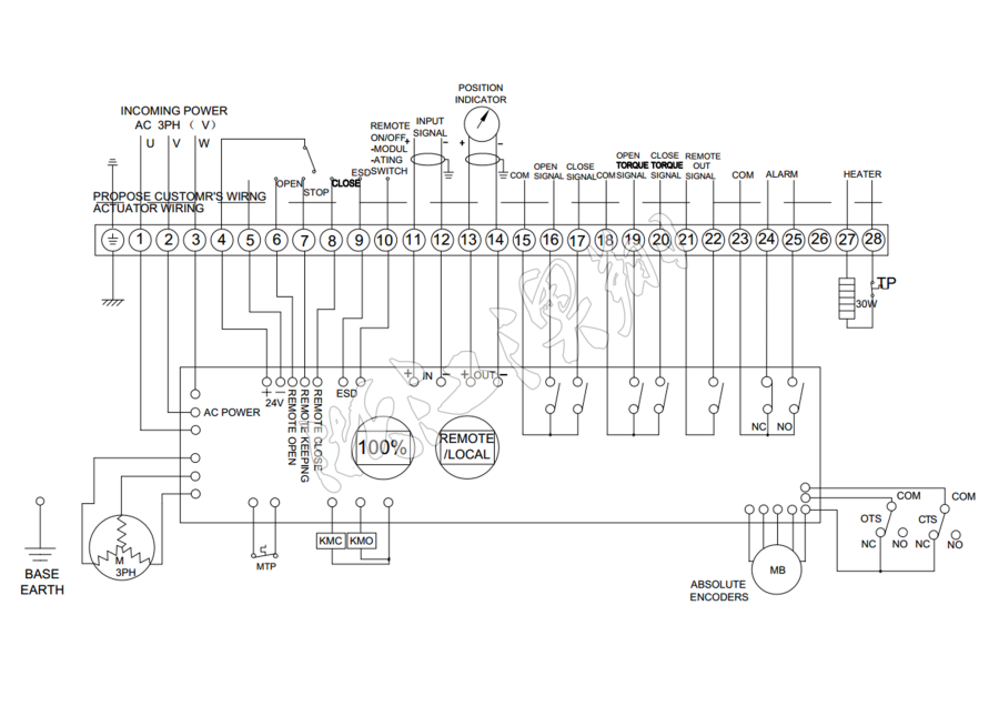 控制線路符合單相或三相電源標(biāo)準(zhǔn),線路布置緊湊合理。執(zhí)行器采用葵花端子配置29個(gè)接線端口,雙密封連接時(shí)端子臺安裝于執(zhí)行器腔體和連接器之間。即使在取下外蓋后或是電纜封套沒有完全密封的情況下,也可保護(hù)設(shè)備免于塵土或濕氣的侵害。接線端子可有Xiao滿足各種附加功能的要求。(可根據(jù)客戶要求另行加工)